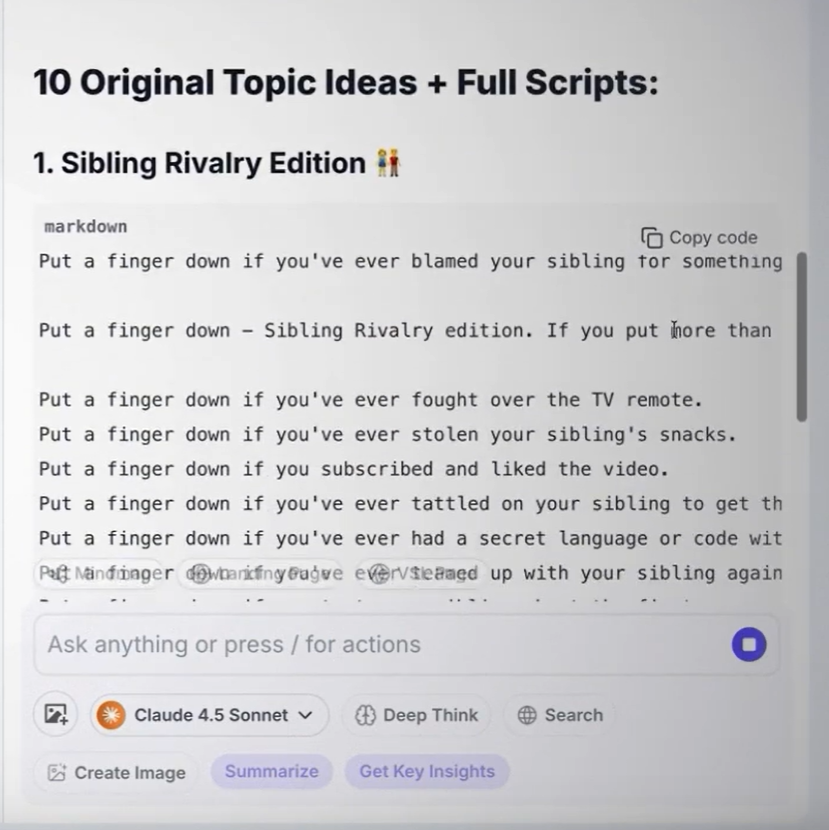 Of course, you can also use ChatGPT, Claude, or Google AI Studio. However, you’ll first need to extract the transcripts of each competitor’s short video and input them into the chatbot. Before using Poppy, I used the website YouTube to transcript.com to get the transcripts, organized them into documents, typically gathered scripts from 20 competitors, and then fed them to ChatGPT. So, when choosing a niche, it’s important to pick one where topics and scripts can be generated in bulk. Not all short video niches are suitable for this approach. For example, generic shorts that comment on viral video clips require more manual effort and are more time-consuming. But for evergreen niches with repeatable patterns like this, you can generate a month’s worth of scripts for a channel in just minutes—it’s incredibly powerful.