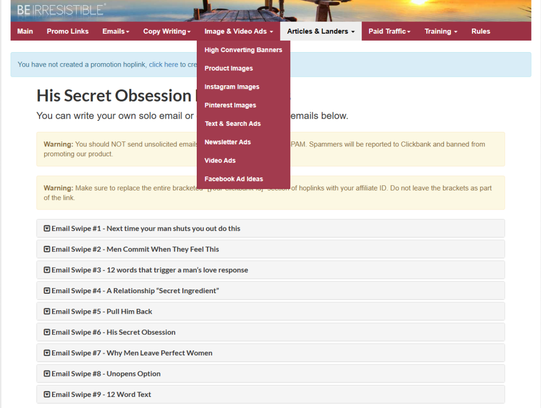Additionally, merchants’ affiliate resource pages can be utilized. For example, this resource page for relationship-related products on CB provides very detailed and diverse copywriting, email templates, as well as ready-made articles and videos. All of these can be leveraged, as the materials themselves are carefully crafted by merchants to resonate with consumers. By using AI for processing or editing, engaging and compelling videos can be created.